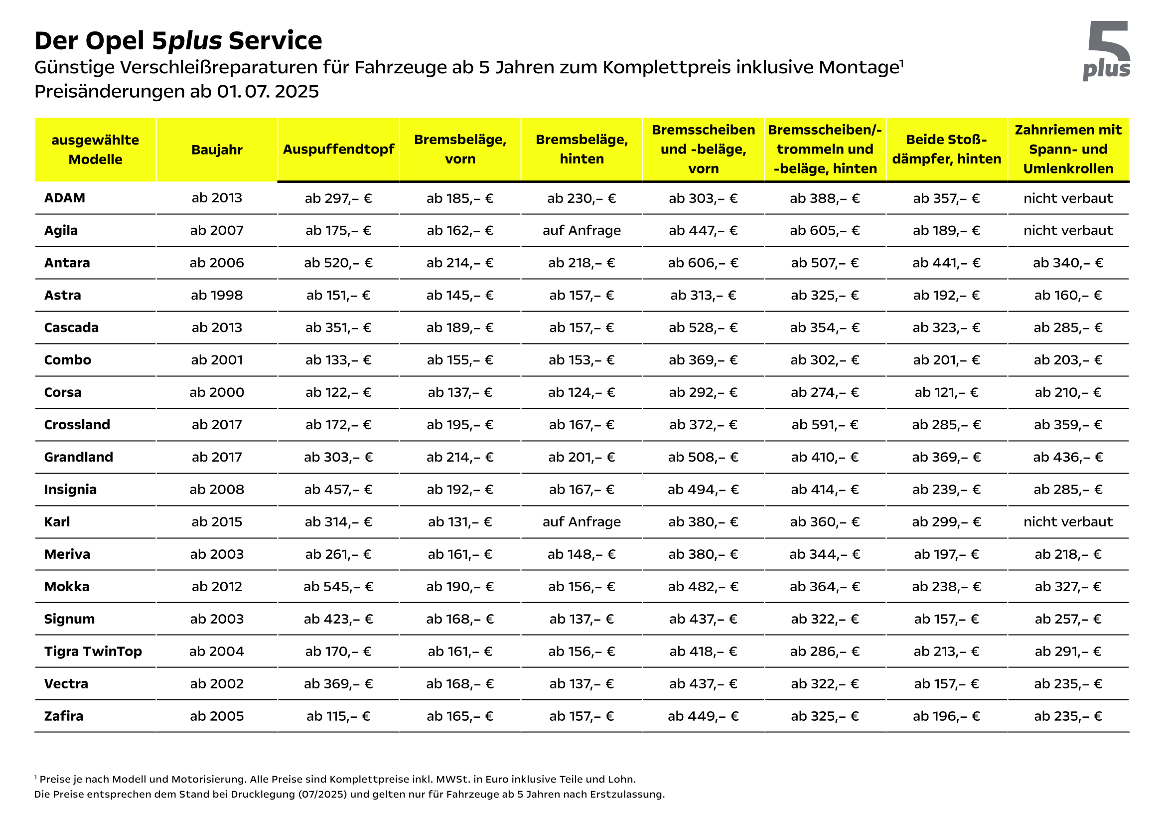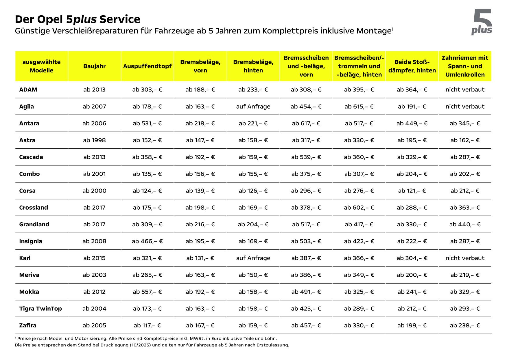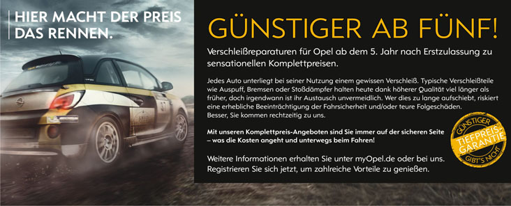 1 Die Opel 5plus Tiefpreisgarantie gilt nur bei Montage durch einen teilnehmenden Opel Partner am Fahrzeug und nur bei Verwendung von Opel Original Teilen by Mopar(R) oder EUROREPAR-Teilen. Voraussetzung ist die Vorlage eines schriftlichen Wettbewerbsangebots: gesondert ausgewiesene Kalkulation von Opel Original Teilen by Mopar(R) oder EUROREPAR-Teilen und Lohn, nicht älter als 14 Tage, Standort des Wettbewerbers innerhalb der BRD und innerhalb eines 30-km-Radius zu unserem Betrieb.